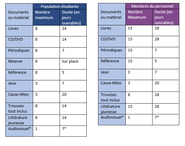 *Pour tous les détails concernant le prêt de matériel audiovisuel, consultez les documents suivants :