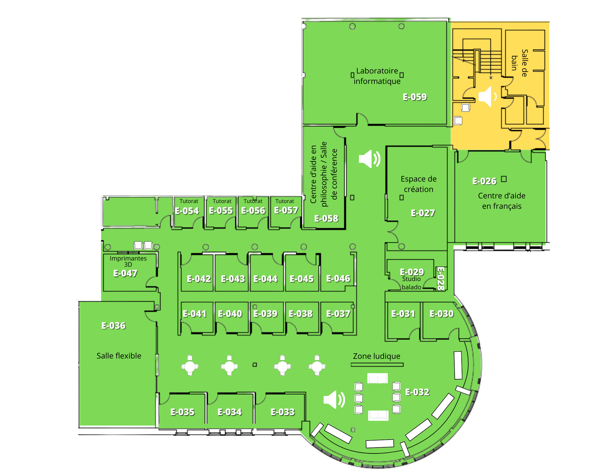 - Zone calme (en jaune) : les discussions à voix basses et chuchotements sont acceptés ;